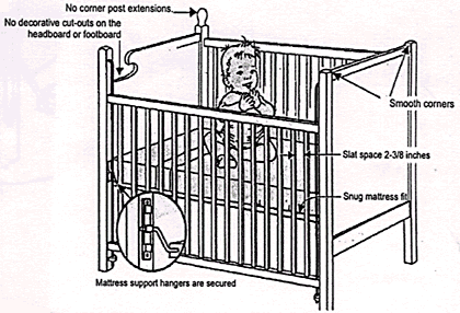 Crib cornerposts can catch clothes, necklaces and strings. Never put anything on a child that can catch on a knob. Inspect all used cribs for knobs and cornerposts. Over 10,000 babies are treated in Hospital Emergency Rooms for crib related injuries each year. |